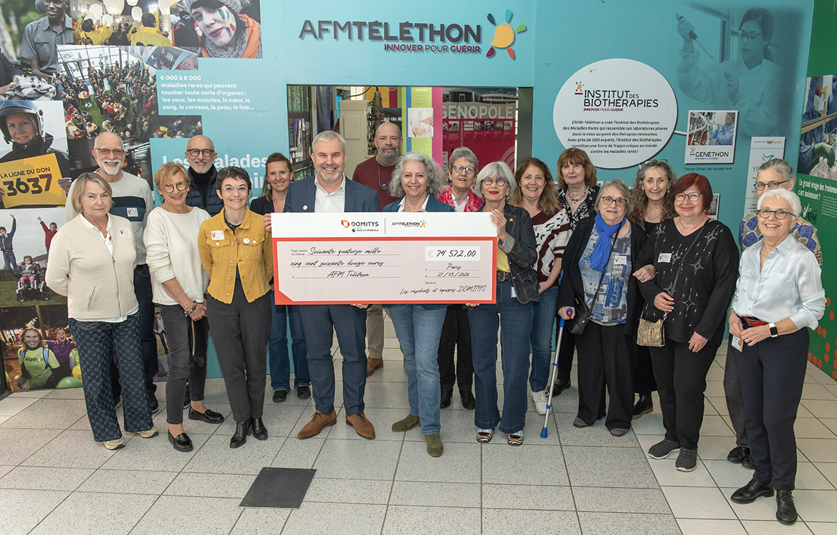 Le groupe Domitys, leader des résidences services seniors en France et filiale du groupe AG2R LA MONDIALE, poursuit son engagement en faveur de la recherche médicale en remettant un chèque de 74 572,01 € à l'association AFM-Téléthon.